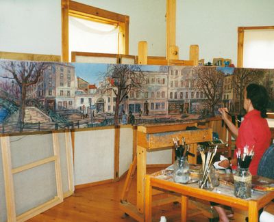 During summers in the eighties, Marcella Maltais settled in St-Isidore de Beauce. The shed used as a workshop became rapidly too small. With the help of her brother Michel, a new workshop was built larger and more luminous allowing to create larger size paintings. She pursued her research by exploring the lights of Beauce, Paris and Greece.